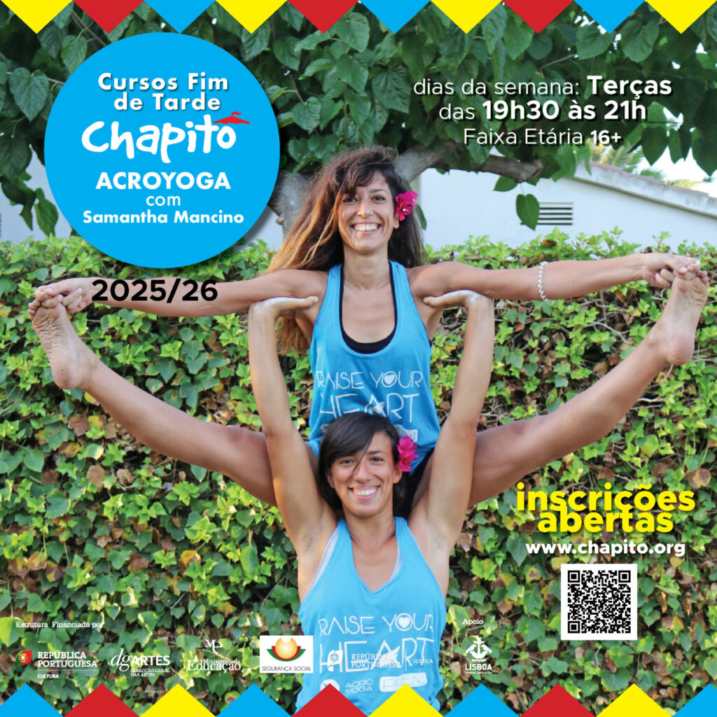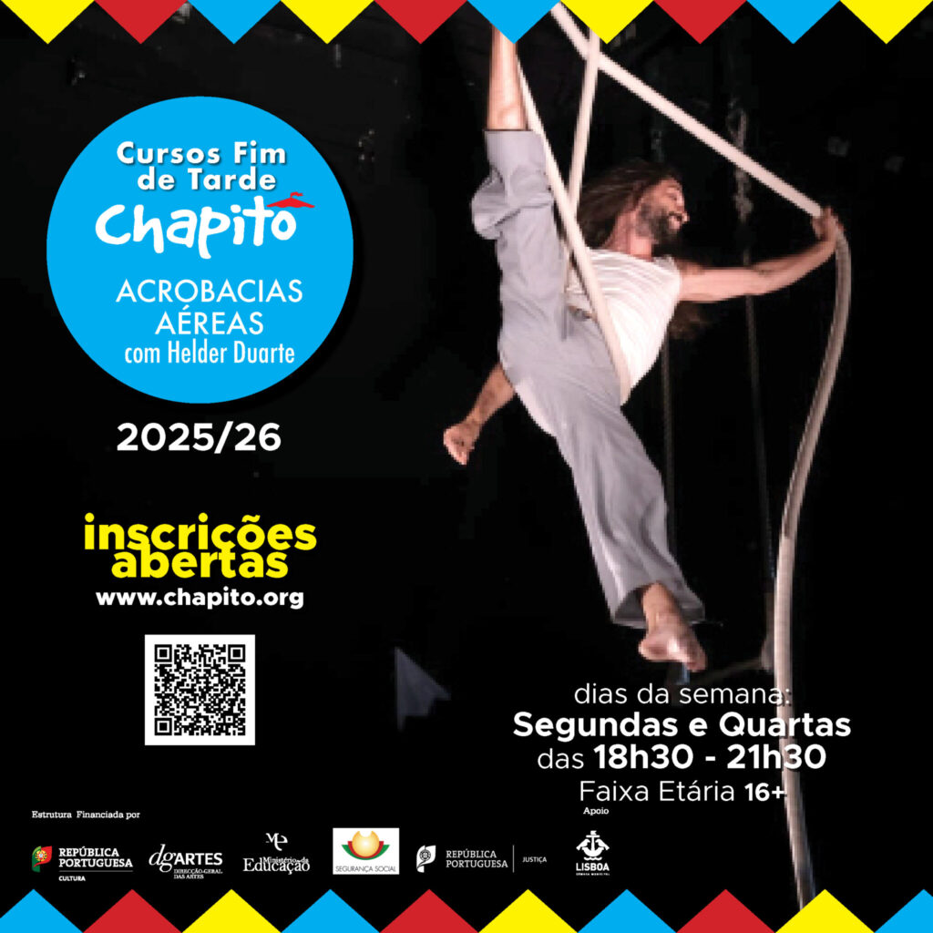 ACROBACIAS AÉREAS com Helder Duarte Duração do curso: de Setembro de 2025 a Junho de 2026 Dia da semana: Segundas e Quartas Horário: 18h30-21h30 Mensalidade: 70€ Faixa Etária: 16+